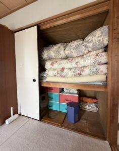 - 残置物が大量:浴室の介護用椅子・バスグッズを含む生活用品が室内に大量に残されており、撤去費用が発生する状態